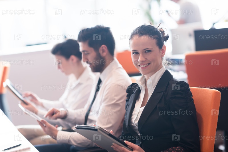 Деловая женщина на заседании с использованием планшета