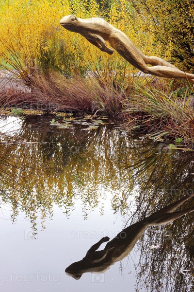 Скульптура лягушки отражается в пруду в осеннем парке