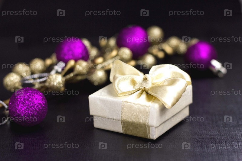 Рождественские бусы и маленький подарок на черном столе