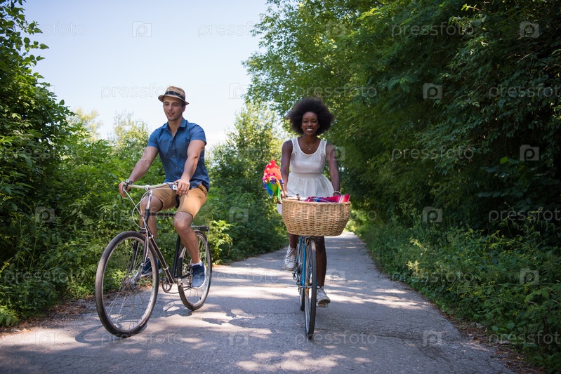 Молодая пара на велосипедах в парке