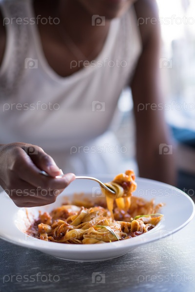 Девушка кушает макароны