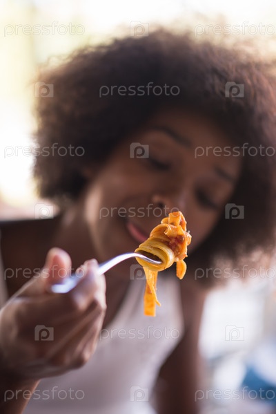 Девушка кушает макароны