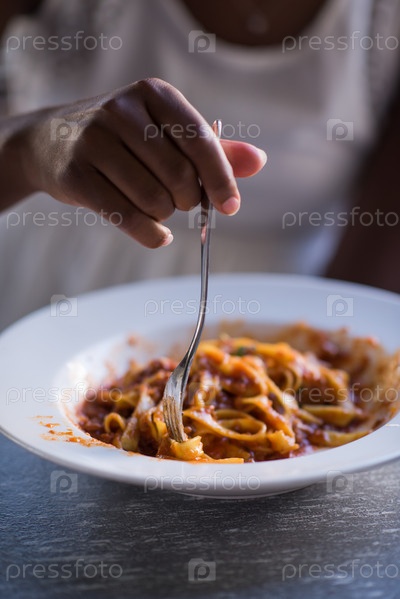 Девушка кушает макароны