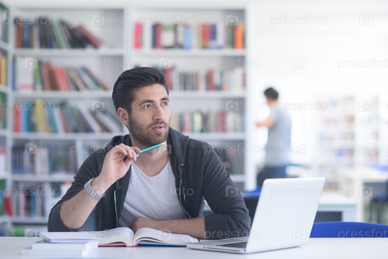 Студент в школьной библиотеке, используя ноутбук для исследования