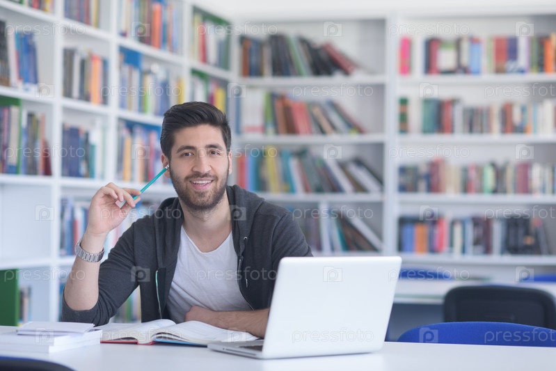 Студент в школьной библиотеке, используя ноутбук для исследования
