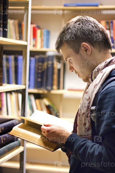 Парень, читающий книгу в библиотеке