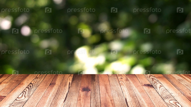Деревянная столешница на размытом фоне листьев