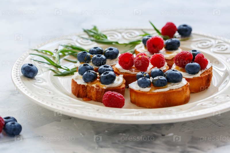 Ягодные кростини на белом блюде