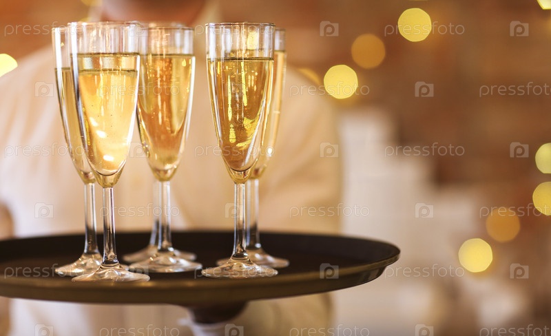 Бокалы на подносе в ярких огнях