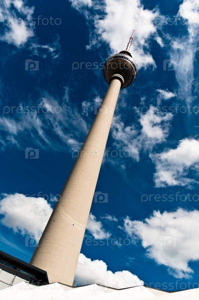 Знаменитая телевизионная башня на Александерплац на фоне облачного неба в Берлине