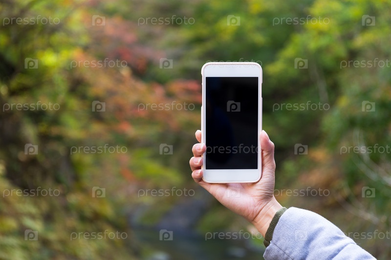 Женщина с пустым экраном мобильного телефона в лесу