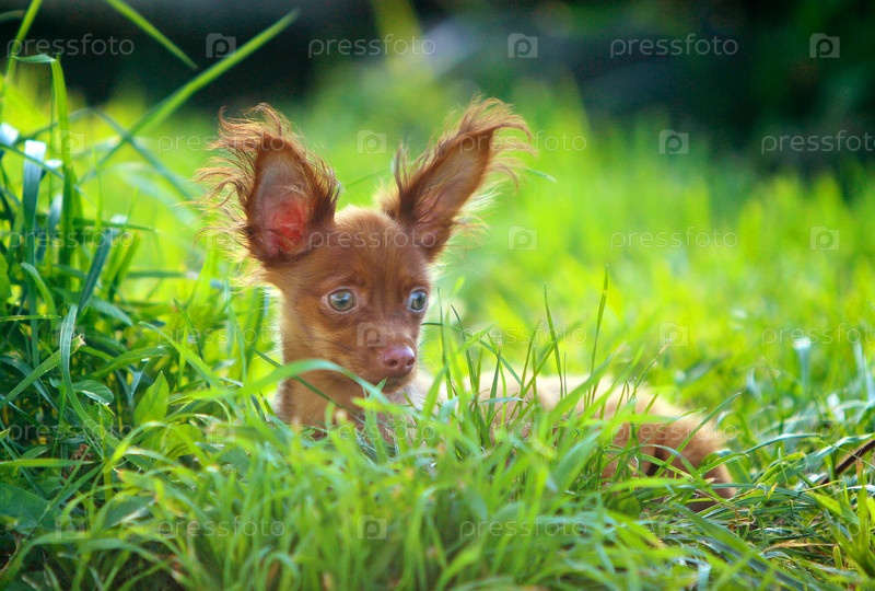 Милый рыжий щенок породы русский той в зеленой траве