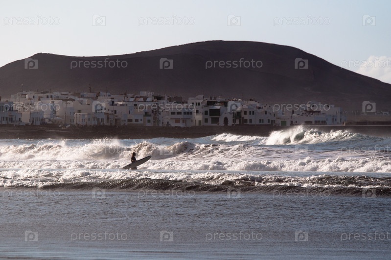 Серфингист стоит в волнах на закате на Лансароте, Канарские острова, Испания
