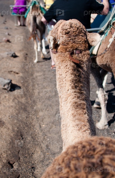 Верблюд везет туристов на эксурсию по острову Лансароте, Канарские острова, Испания