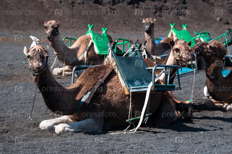 Верблюды с седлами лежат на земле в Национальном парке Тиманфая, остров Лансароте, Канарские острова, Испания
