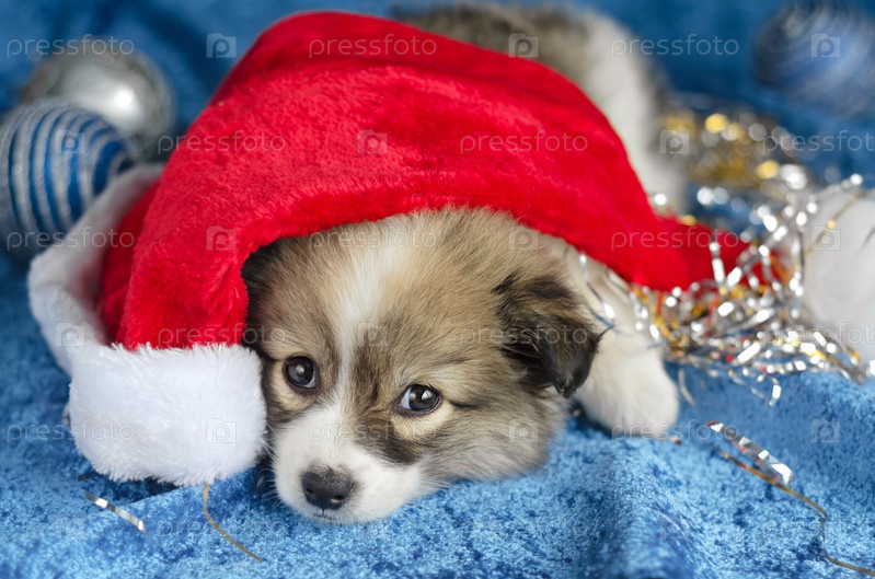 Маленький щенок в красной шляпе Санты