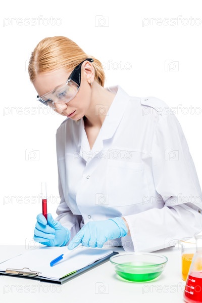 Химик в защитной форме, за столом