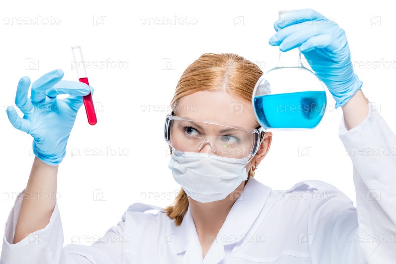 Молодой профессиональный химик с опасными веществами в пробирке делает анализ