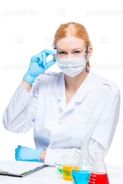 Портрет молодого успешного химика в защитной одежде в лаборатории