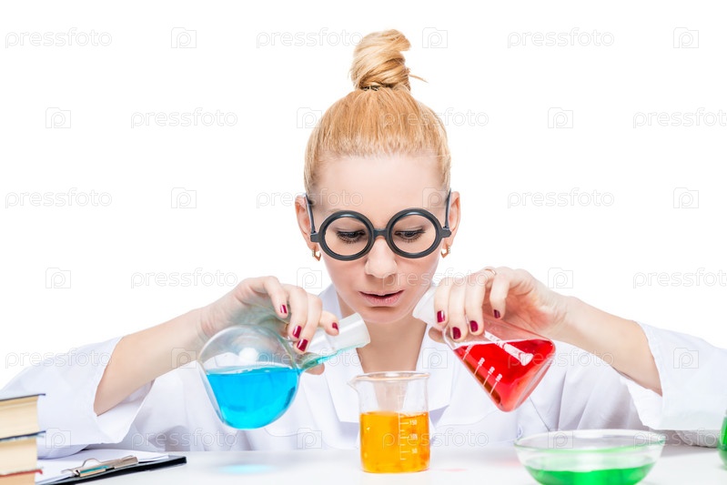 Химик-лаборант с пробирками с опасными веществами на белом фоне