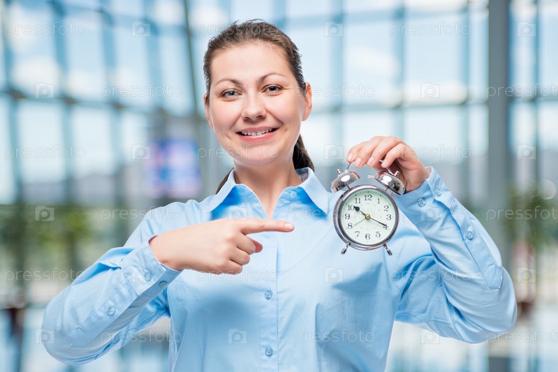 Счастливая успешная дама с будильником в руке в офисе