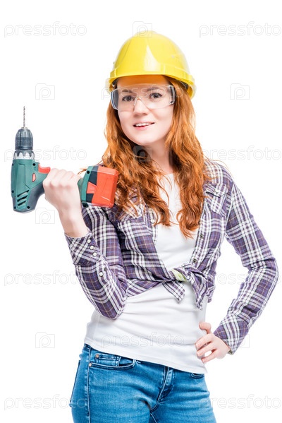 Красивая женщина с дрелью в защитной одежде готова к работе