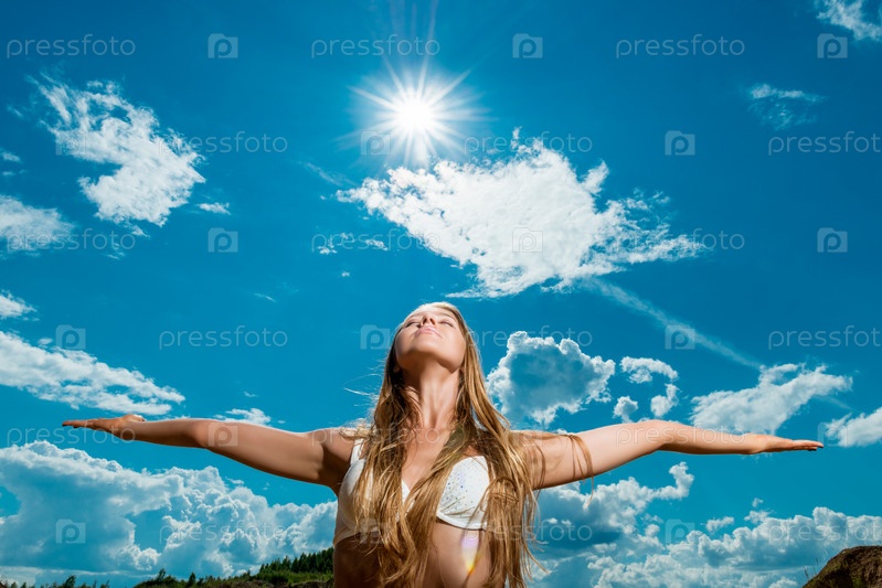 Красивая женщина на фоне солнца и неба