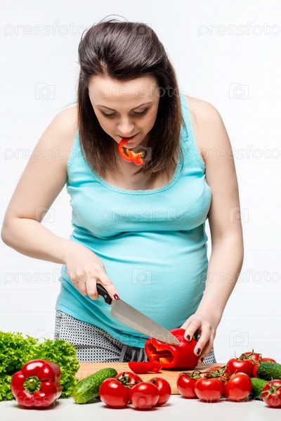 Беременная женщина готовит салат из овощей на кухне