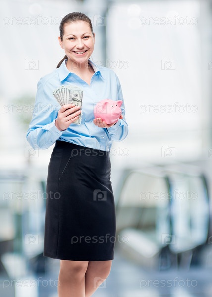 Счастливый предприниматель держит копилку и доллары