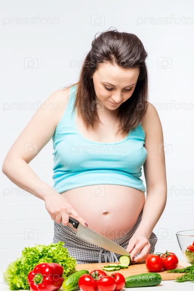 Молодая беременная брюнетка готовит здоровую пищу