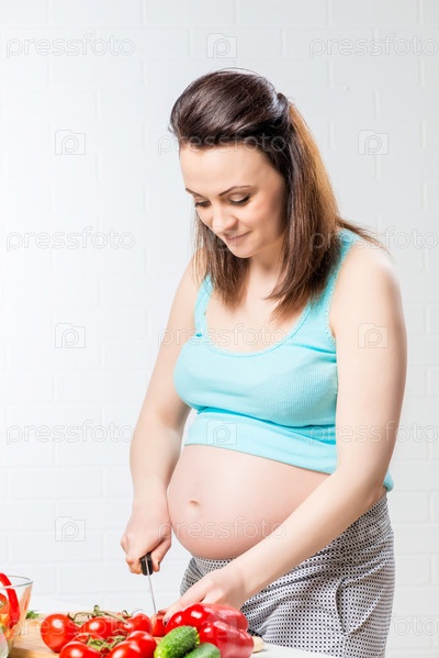 Красивая беременная девушка готовит салат из свежих овощей