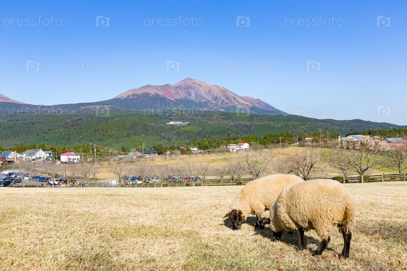 Овцы на пастбище и гора Киришима