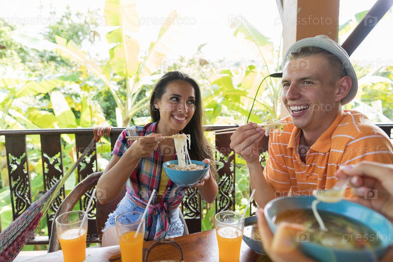 Молодые люди едят китайскую лапшу