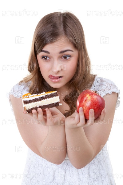 Молодая женщина выбирает между полезной и вредной пищей, белый фон