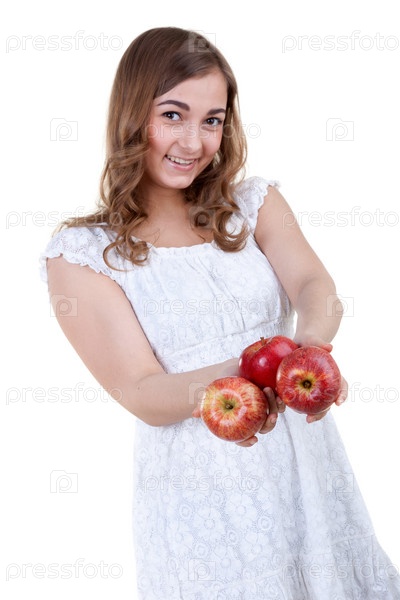 Молодая женщина с яблоками, изолировано на белом фоне