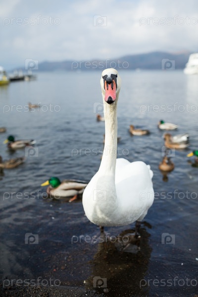 Лебедь с утками в воде