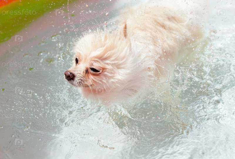 Белая собака, стряхивая воду