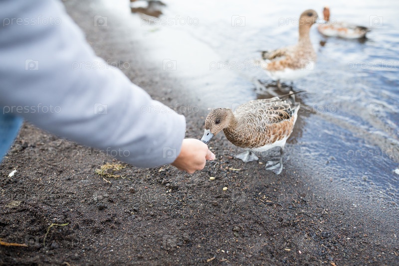 Кормление уток на берегу озера