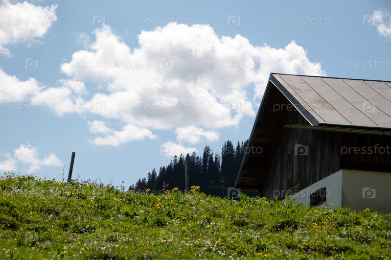 Дом на цветущем альпийском лугу на фоне леса
