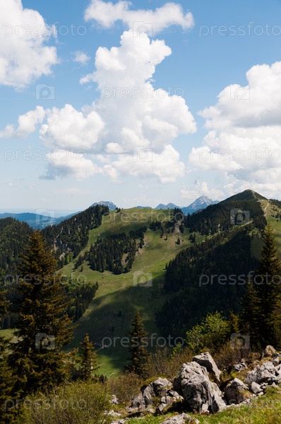 Панорамный вид на Баварские Альпы с Боденшнайд близ Шлиерзее, Бавария, Германия
