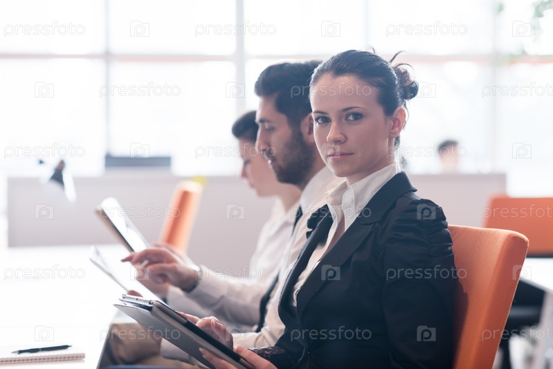 Деловая женщина на заседании с использованием планшета