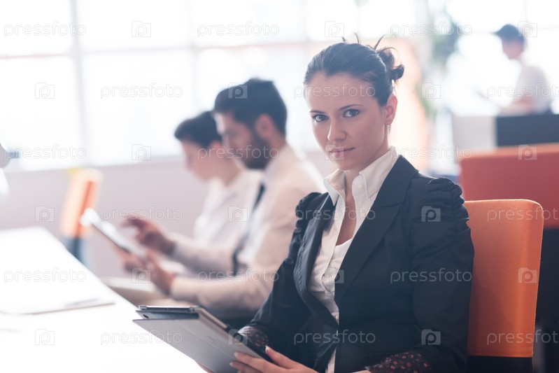 Деловая женщина на заседании с использованием планшета
