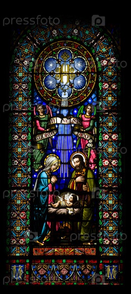 Витраж с изображением сцены Рождества, младенец Иисус с Марией и Иосифом