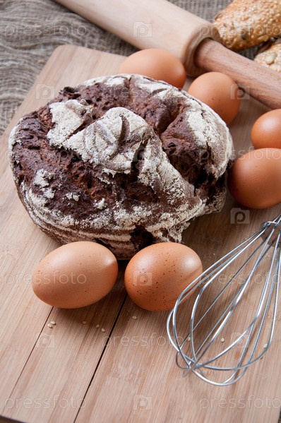 Буханка черного хлеба, яйца и кухонная утварь