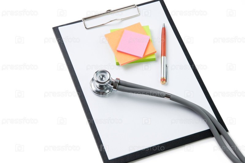 Стетоскоп, ручка и стикеры на планшете