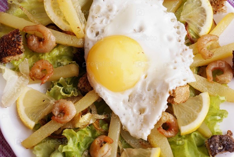 Креативный салат-ассорти с морепродуктами, свежими овощами и яичницей