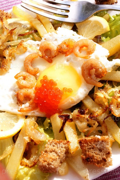 Креативный салат-ассорти с морепродуктами, яичницей и свежими овощами