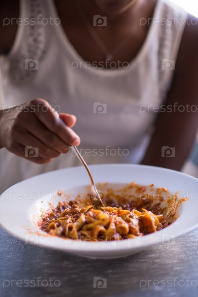 Девушка кушает макароны