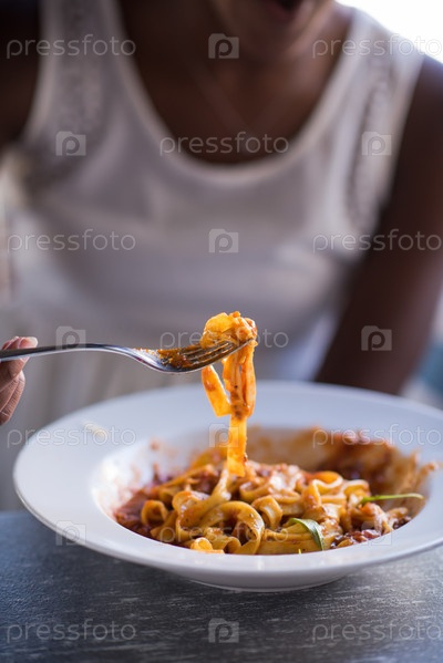 Девушка кушает макароны