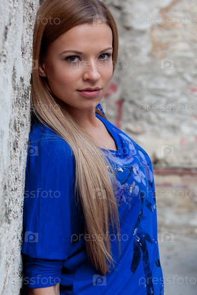 Симпатичная девушка в синей блузке стоит у бетонной стены
